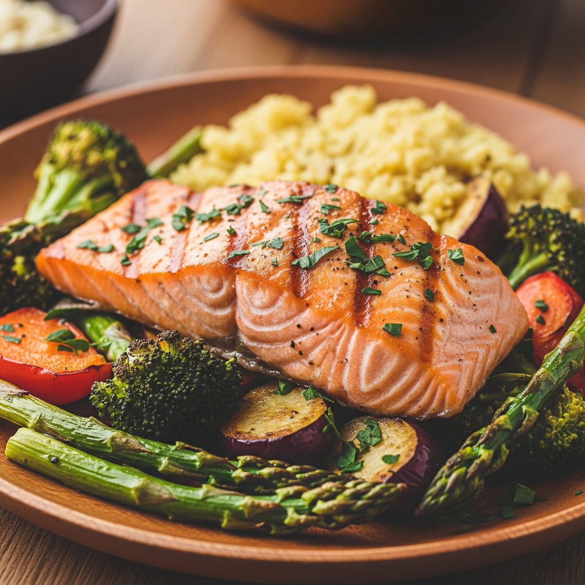 Теперь пришла очередь лосося. Филе нужно посолить и поперчить с обеих сторон, после чего выложить его на противень рядом с овощами. Сбрызнуть оставшимся оливковым маслом для аромата и золотистой корочки.
