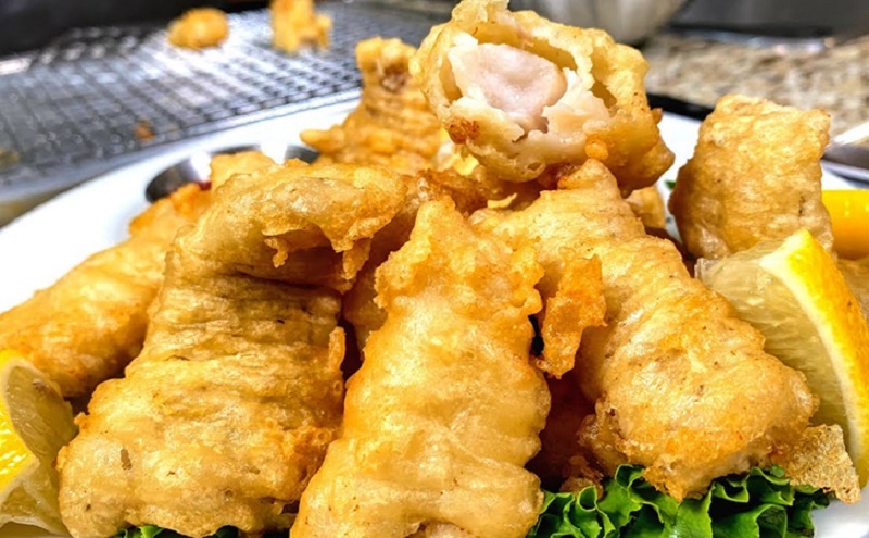 5. В глубокой сковороде разогрейте достаточное количество растительного масла. Обмакивайте кусочки рыбы в тесто и аккуратно опускайте в горячее масло. Жарьте до образования золотистой корочки со всех сторон.