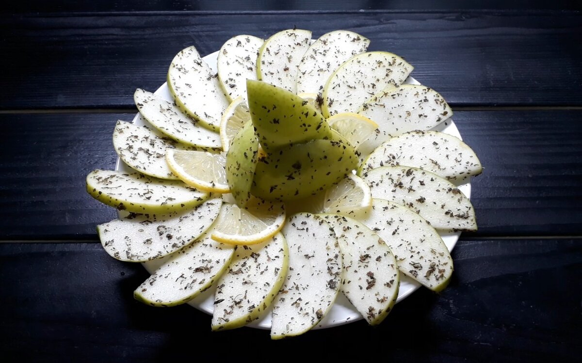 Основной ингредиентом закуски станут зеленые кисло-сладкие яблоки, а сорт Гренни Смит – идеальный вариант. Эти яблоки легко найти как в супермаркете, так и на рынке. Их кислинка отлично сочетается с добавляемыми ингредиентами. Простой, но эффектный подход: яблоки разрезаются пополам, из них удаляется сердцевина и нарезаются тонкими пластинами.