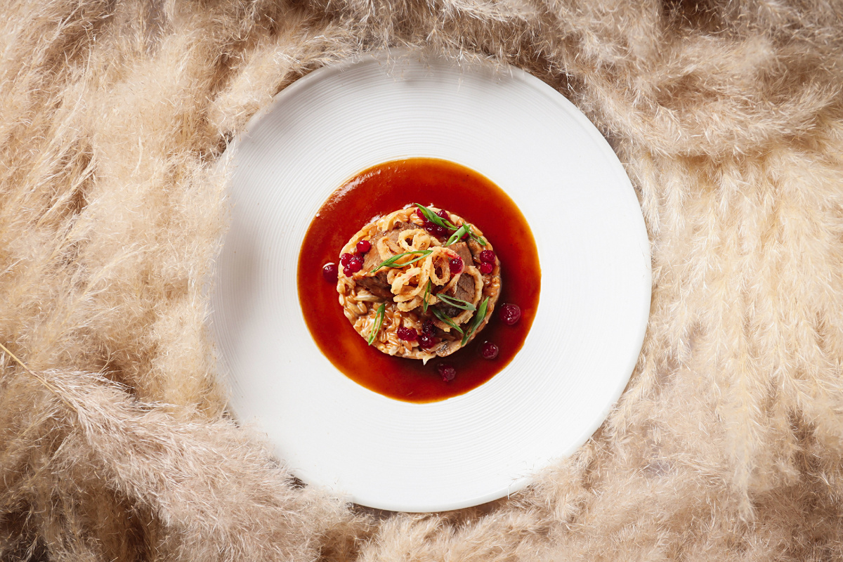 Для подачи выкладываем подушку из полбы на тарелку, сверху кладем томленого ягненка. Это блюдо точно не оставит равнодушным!