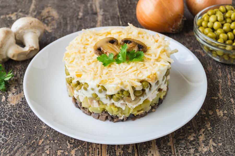 При желании, украсить салат листьями зелени, грибами и горошком. Для достижения наилучшего вкуса, оставить в холодильнике на 1-1.5 часа, чтобы все слои пропитались, сообщает канал.