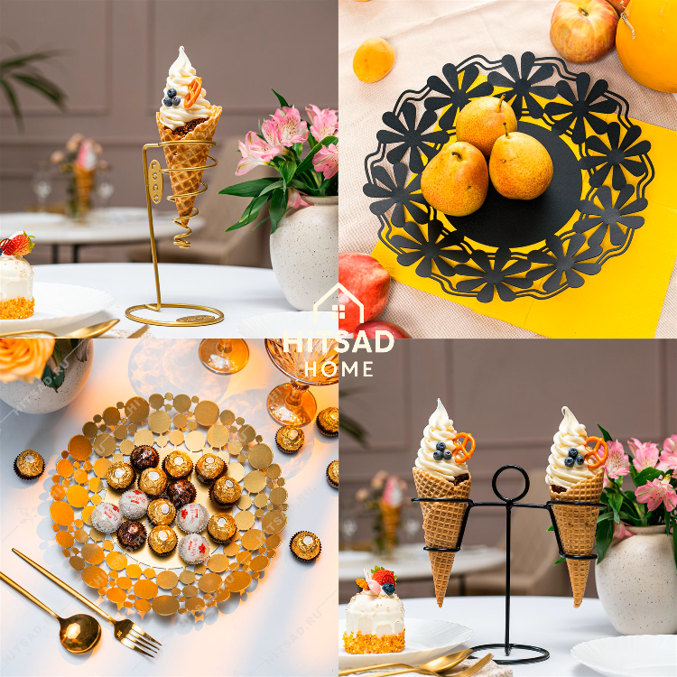 Сервировочные подставки от HiTSAD идеально подойдут тем, кто ценит домашнее тепло в красивой подаче блюд. Металлические конструкции и корзины прекрасно подходят для подачи мороженого, закусок и десертов. Они легко вписываются в интерьер, независимо от стиля — от минимализма до прованса.