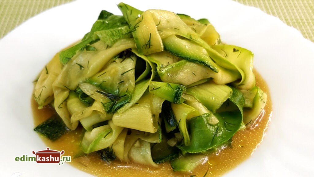 Кабачки нарезать на очень тонкие полоски, что можно сделать при помощи овощечистки. Эти слайсы залить подготовленным соусом и аккуратно перемешать. Накрыть пленкой или крышкой и оставить мариноваться на 30 минут или дольше (максимум до 2 часов). Для более насыщенного вкуса закуску можно убрать в холодильник на ночь. Подавать можно как самостоятельное блюдо или гарнир.