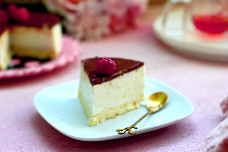 Для шоколадной заливки нагреть молоко до почти кипящего состояния, положить нарубленный шоколад и перемешать до однородной массы. Вылить заливку на застывший мусс и разровнять. Убрать в холодильник еще на 20 минут.