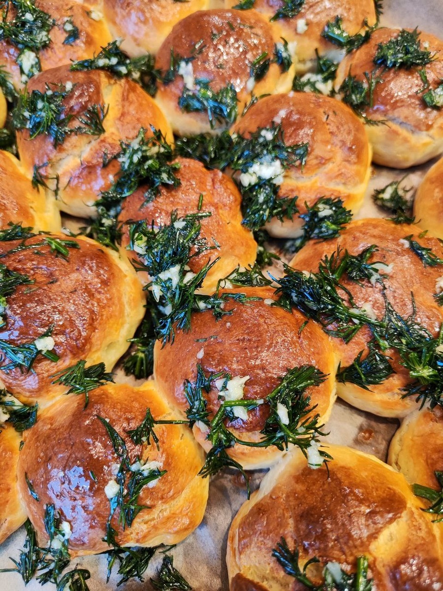 Как только булочки будут готовы, сразу же обильно смажьте их чесночным соусом.