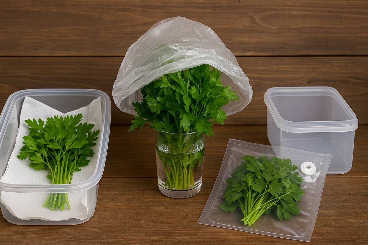 - Стакан с водой: Поместите зелень в стакан с 1–2 см воды, накройте пакетом. Меняйте воду каждые два дня для оптимального хранения.