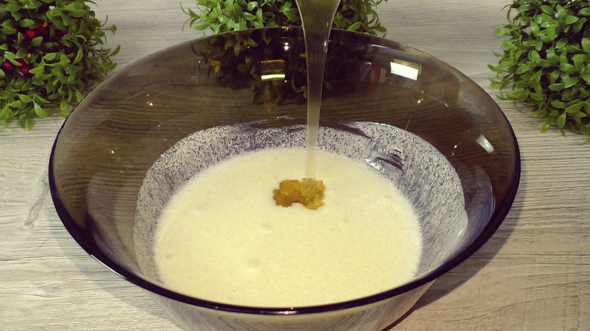 Для подготовки теста начните с сочетания кефира и сметаны в глубокой миске. Затем добавьте сахар и соль, хорошо перемешайте. Влить растопленный мёд (в случае, если он засахарился, можно растопить его на водяной бане). Как альтернатива меду, используйте любой сладкий сироп или увеличьте количество сахара.