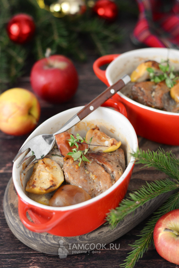 Приготовление начинается с нарезки свинины: кусочки должны быть примерно одинакового размера, чтобы они равномерно приготовились. Далее, яблоки, лучше всего кислого сорта, следует нарезать на четвертинки или шестигранники, удаляя сердцевину, и смешиваем с мясом в глубокой миске.