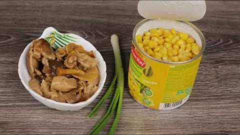 Теперь настало время добавить зеленый лук: тщательно промыть, обсушить и нарезать его ножом, после чего отправить к остальным ингредиентам. Кукурузу из банки освободить от жидкости и добавить зерна в миску с остальными ингредиентами. Приправить смесь солью и перцем по вкусу и заправить майонезом, тщательно перемешивая все компоненты.