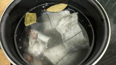 Начинать следует с подготовки рыбы: её необходимо почистить, нарезать крупными кусками и отварить в воде с добавлением лаврового листа и перца. Не забудьте добавить немного соли. Бульон не выливать — он пригодится позже. Остывшую рыбу разбирают на кусочки, удаляя кожу и кости.