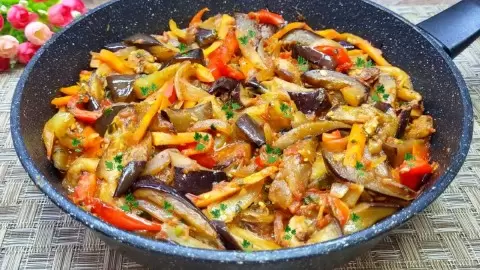 - В той же сковороде обжарьте сладкий перец до мягкости, затем перенесите его к баклажанам.