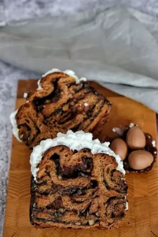 5. Выровняв тесто, смажьте его шоколадной пастой и посыпьте орехами. Сверните в рулет и разрежьте вдоль почти до конца. Скрутите улиткой каждую часть и уложите в форму для выпечки. Дайте постоять ещё 20 минут.