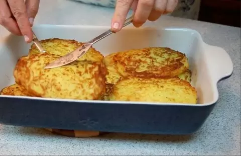 Разогрейте растительное масло на сковороде. Выложите ложку картофельной массы, затем положите кусочек мяса и сверху снова ложку картофеля. Обжаривайте до образования золотистой корочки.