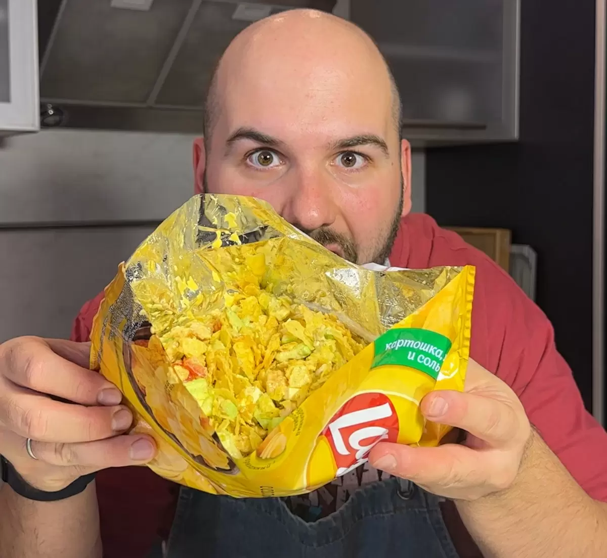 - Осторожно измельчить чипсы внутри упаковки, чтобы получить крошку, затем открыть упаковку с боку.