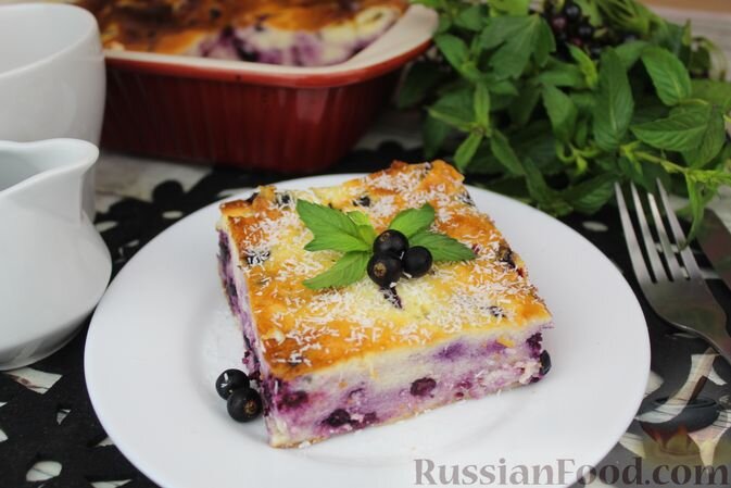 - Творожная запеканка со смородиной: Легкое и воздушное блюдо, в котором кислота смородины прекрасно дополняет нежный творог.