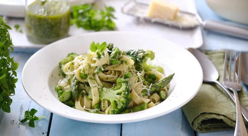 Готовка пасты Примавера не потребует значительных усилий. За приблизительно полчаса можно создать легкое, но сытное блюдо, насыщенное витаминами. Порция пасты обойдется в около 280 калорий на 100 грамм.