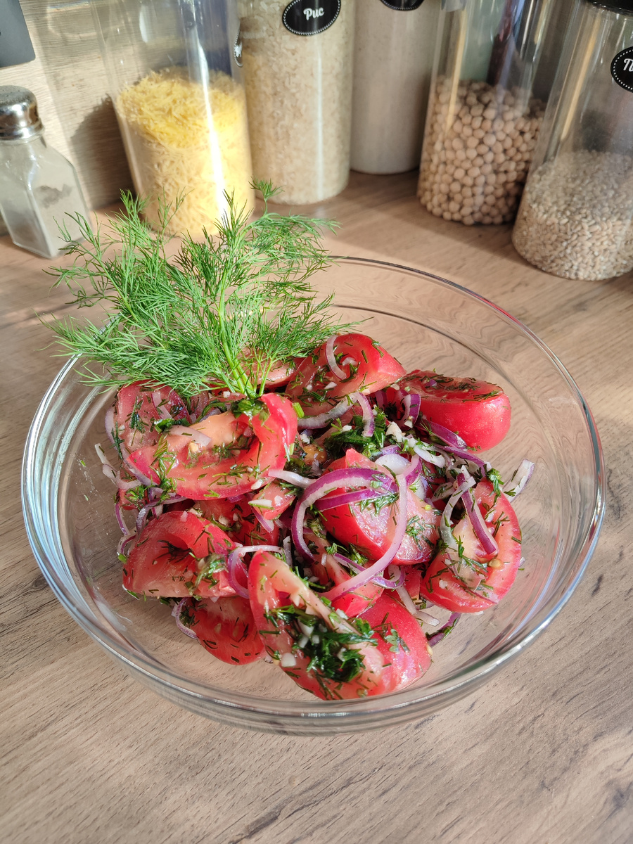 Смешайте все ингредиенты: помидоры, лук, зелень и чеснок, залейте маринадом и аккуратно перемешайте.
