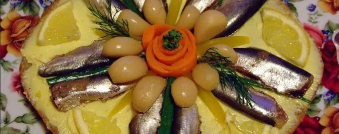 Нижнюю часть хлеба щедро намажьте маслом, можно добавить немного нарезанной зелени для аромата. Установите верхнюю часть буханки на смазанное масло основание и также намажьте ее маслом. Затем равномерно выложите кильку, начиная с центра и двигаясь к краям. Чтобы украсить торт, используйте соломку из болгарского перца, перья зеленого лука и дольки лимона.