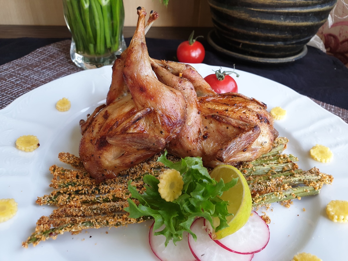 Вдохновившись предпочтениями своего ребенка, который обожает перепелов и кроликов, было решено создать новый способ готовки, заменяющий привычный фаст-фуд. Вместо картофеля фри использована спаржа, что вряд ли вызовет восторг у каждого ребенка, но с правильным подходом можно создать интересное и вкусное сочетание.