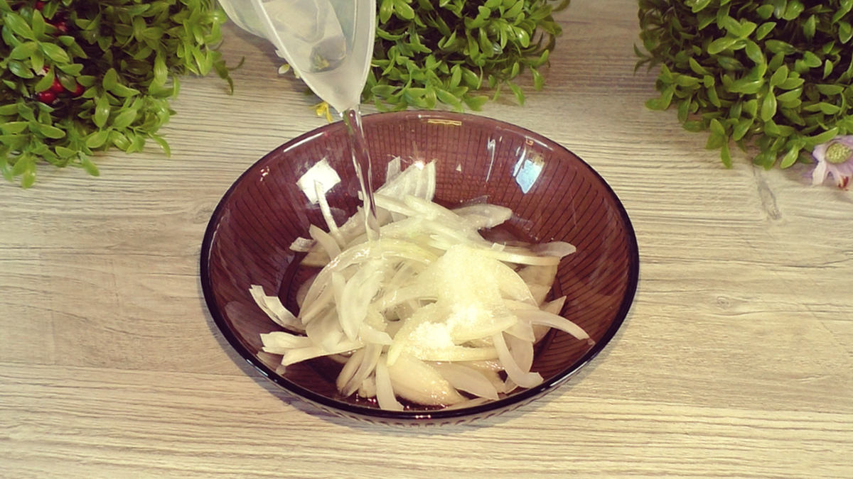 Начните с маринования лука. Очистите одну маленькую луковицу и нарежьте ее тонкими полукольцами. В глубокой чашке смешайте лук с солью, сахаром и уксусом. Залейте смесь холодной водой, тщательно перемешайте и оставьте на время, пока вы готовите баклажаны и яйца.