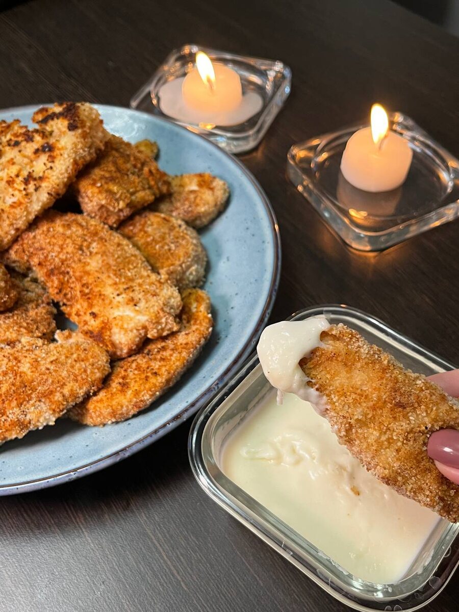 Когда наггетсы готовы, выкладывайте их на тарелку, а соус подавайте в отдельной мисочке. Это идеальное сочетание: как в фастфуде, но намного полезнее и вкуснее. В качестве гарнира отлично подойдет свежий салат из морковки и огурца – легкий и гармоничный.