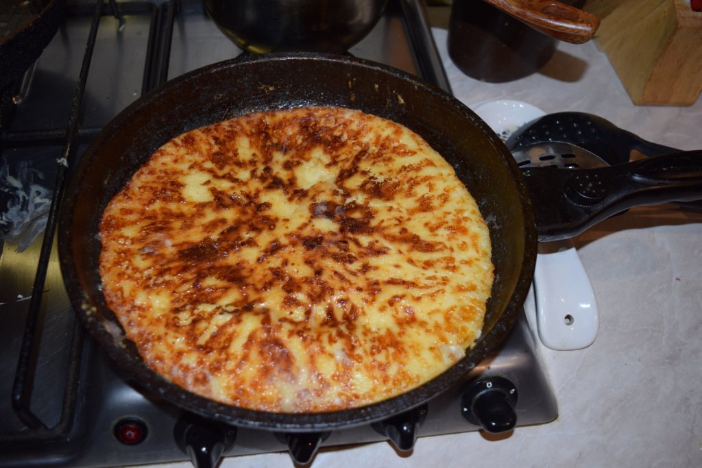 Полученное творожное «тесто» разделите на 2-3 части и раскатайте в лепешки, подходящие по размеру для вашей сковороды. Разогрейте сковороду с топленым маслом, добавьте раздавленный зубчик чеснока для аромата и обжаривайте хачапури под крышкой до получения золотистой корочки.