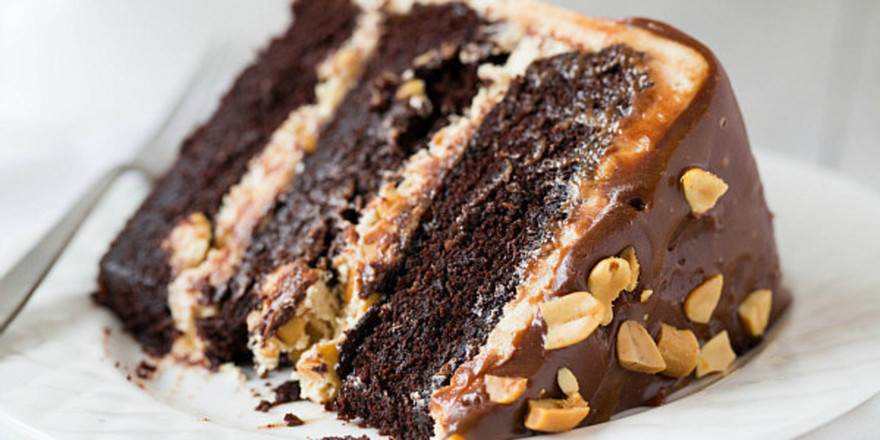 Шоколад и масло растопить, затем добавить в взбитые сливки. Понемногу вводить карамель и арахис, тщательно перемешать. При сборке торта чередовать коржи: пропитанные обычным сиропом и карамелью, разделяя их кремом. Завершить последний корж сиропом. После того как торт отстоится, накрыть ганашем на основе горького шоколада.