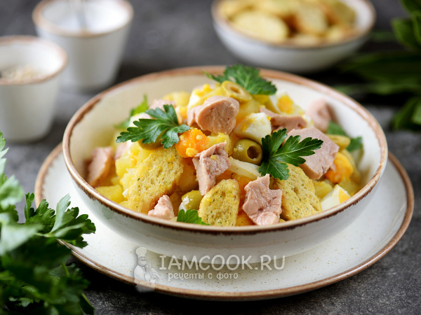 - Салат с печенью трески и сухариками: Ингредиенты включают печень трески, лук, картофель, яйца и сухарики. Время приготовления — всего 30 минут. Калорийность на порцию: 236 кКал.