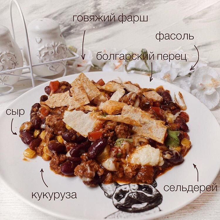 Готовое чили кон карне подайте на стол с посыпанным сверху сыром и украсьте чипсами из лаваша. Также можно сопровождать это блюдо рассыпчатым рисом басмати, картошкой в мундире или кускусом. Для идеального завершения добавьте натуральный йогурт и дольки лайма.