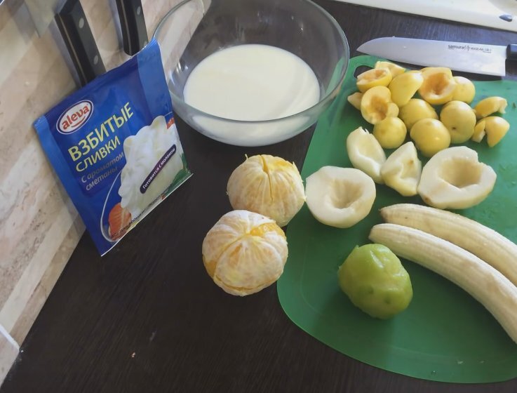 Вам потребуется очистить и нарезать кубиками киви, яблоки, груши, апельсины и бананы. Затем тщательно перемешайте все фрукты.