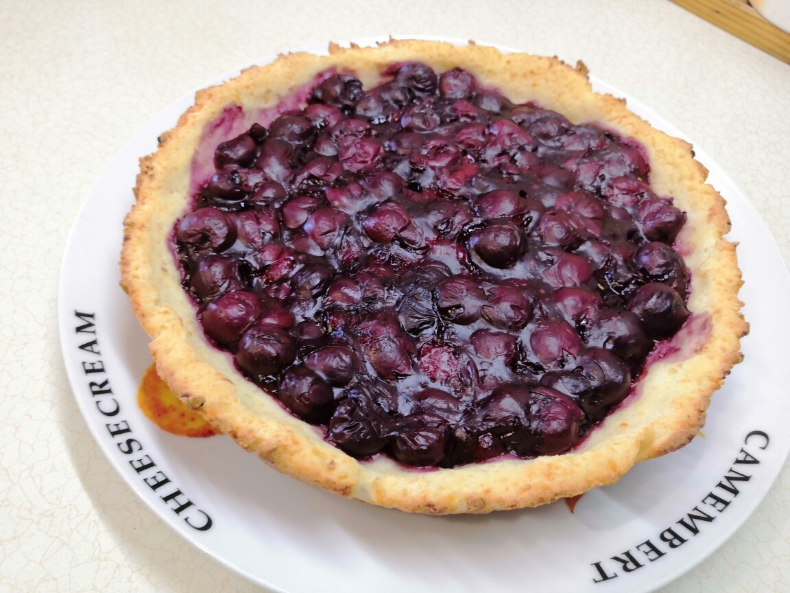 4. Когда основа подрумянится, её нужно извлечь из духовки, равномерно выложить вишню на поверхность и снова ставить в духовку еще на 15-20 минут при той же температуре.