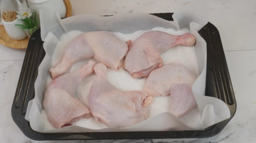 Соль эффективно распределяет тепло и предотвращает разбрызгивание жира, позволяя мясу оставаться нежным и сочным. А отсутствие приправ подчеркивает богатый природный вкус курицы.