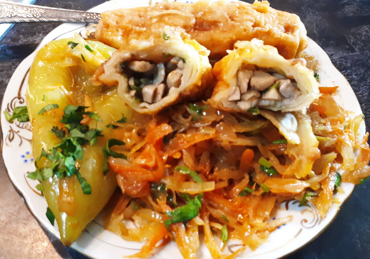Теперь перейдем к овощам. Тушите капусту с морковью и луком, добавьте томатную пасту и готовьте до полуготовности. Тесто раскатайте в тонкий пласт, нарежьте квадратами и заполните их грибной начинкой, скручивая в рулеты.