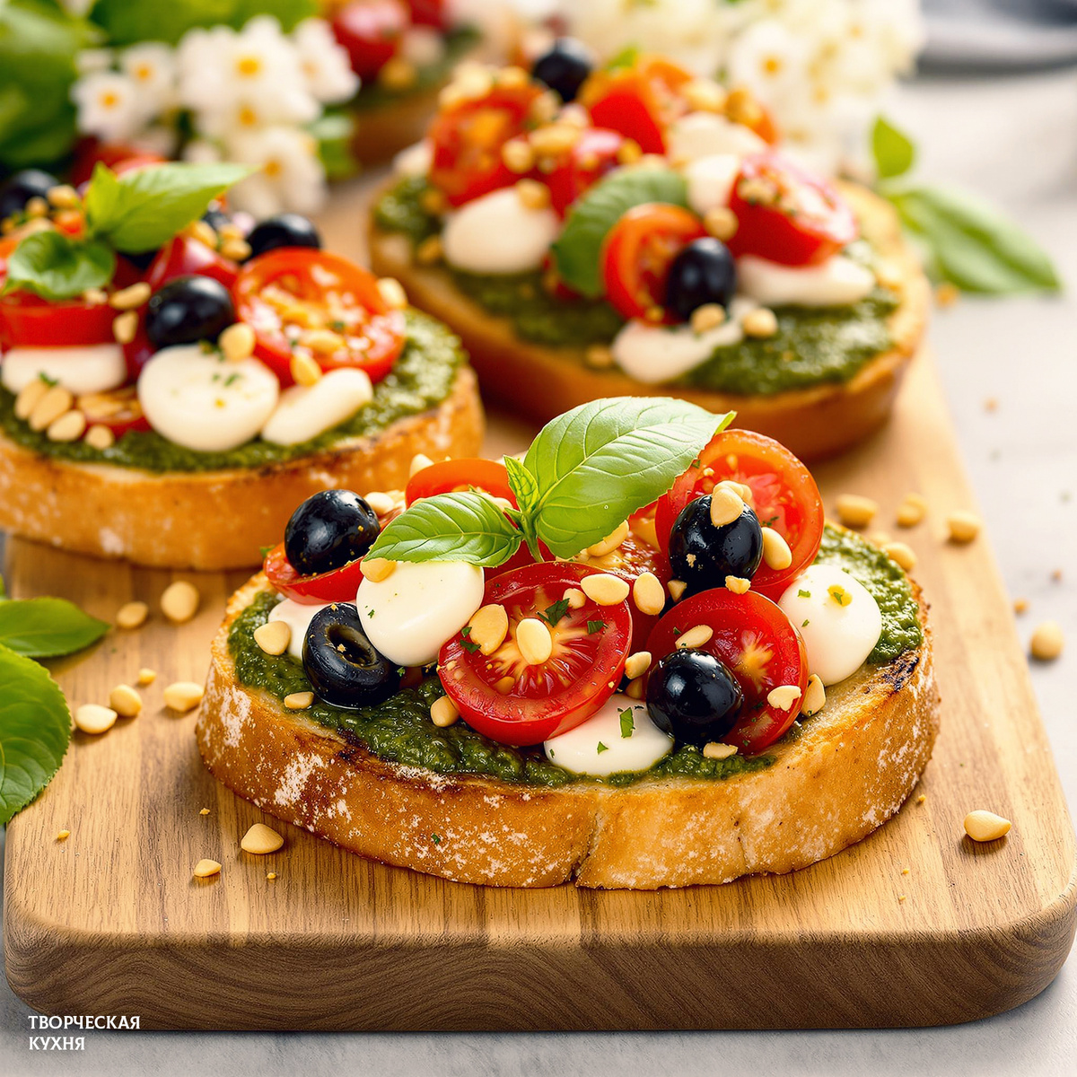 Далее, нарежьте багет на ломтики и слегка поджарьте их на оливковом масле. Для дополнительного аромата можно натереть корочку чесноком. На горячие тосты аккуратно намажьте соус песто, затем выложите подготовленную начинку. Завершите блюдо посыпкой из кедровых орехов и свежими листочками базилика.