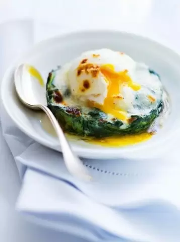 Разогрейте духовку до 200 градусов. Распределите шпинат по порционным формочкам, сверху разместите яйца и залейте соусом бешамель. Посыпьте тертым сыром и отправьте в духовку на 5 минут.