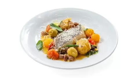 В пленительном мире гастрономии, рыба занимает почетное место. Мы представляем вам уникальный рецепт палтуса, который выделяется насыщенным средиземноморским характером благодаря гармонийному сочетанию пармезана, зеленого базилика, оливок, маслин, каперсов и чеснока. Дополняет это великолепие сухое белое вино.