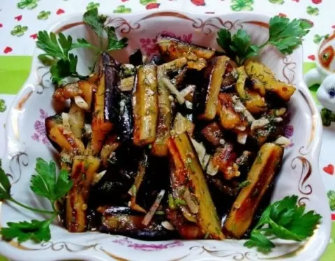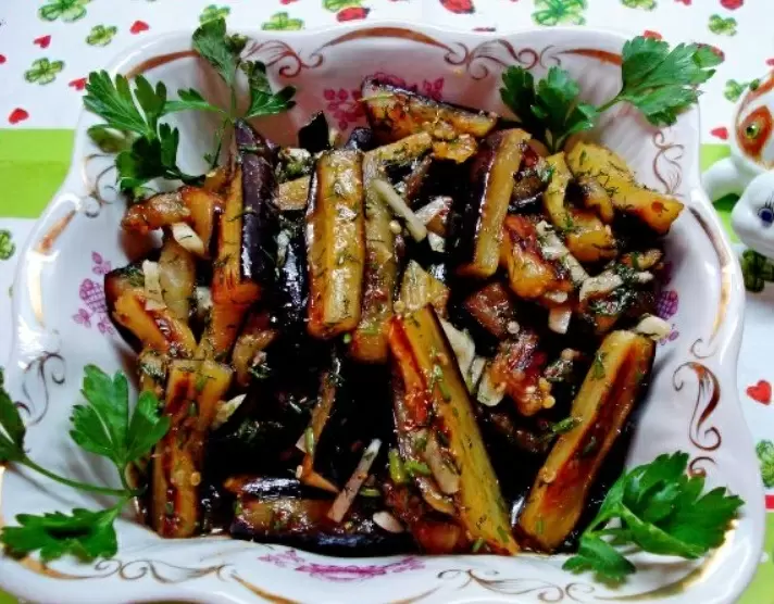 В еду включайте мед и лимонный сок, прокипятив их в течение одной минуты, а затем полить этой карамельной заправкой баклажаны. Убрать в холодильник для охлаждения и пропитывания на 2 часа. После этого переложить баклажаны в салатник и украсить свежей зеленью.