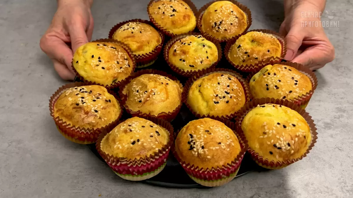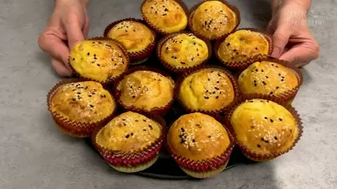 На следующем этапе нужно подготовить формы для выпечки. Укладываем бумажные вкладыши и заполняем их частью теста. Затем сверху уютно укладываем уже готовую начинку. Заключительный аккорд – заливаем оставшимся тестом и посыпаем семенами кунжута. Выпекаем в предварительно разогретой до 180°С духовке в течение 30-35 минут.