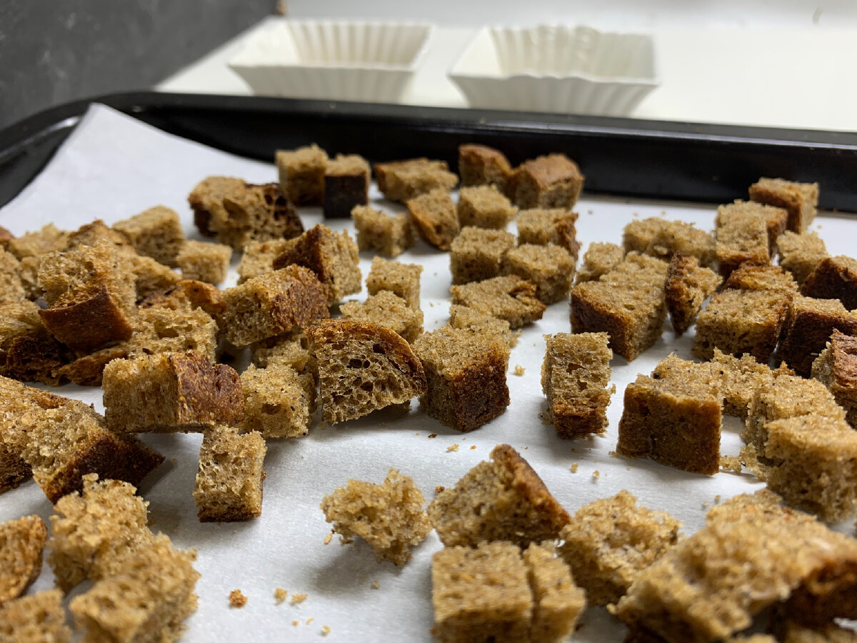 - Хлеб: нарезать на кубики.