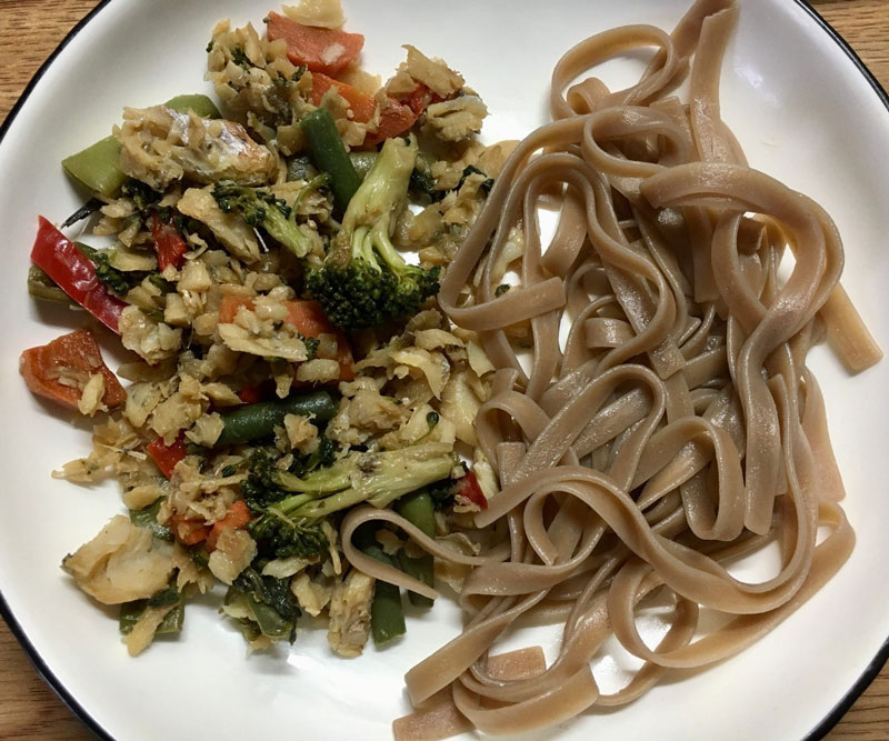 Содержание белков, жиров и углеводов с минтаем и овощами на 100 г составляет 109 ккал, 11,2 г белков, 5,3 г жиров и 3,4 г углеводов. Овощи получаются «аль денте» — сохраняют свою хрусткость и свежесть.